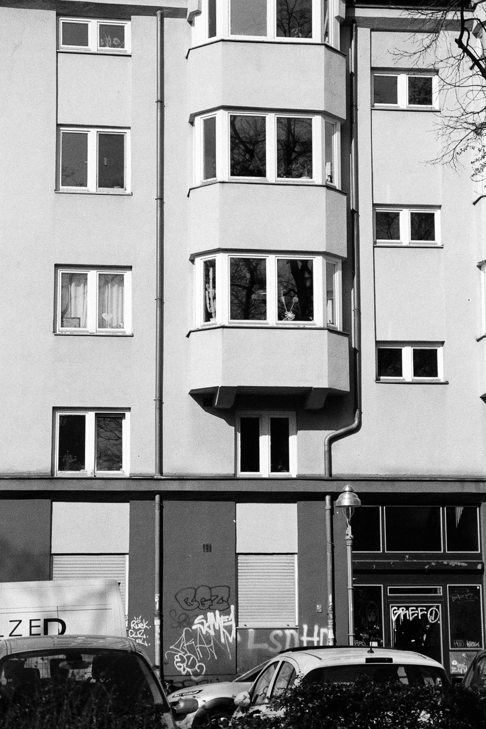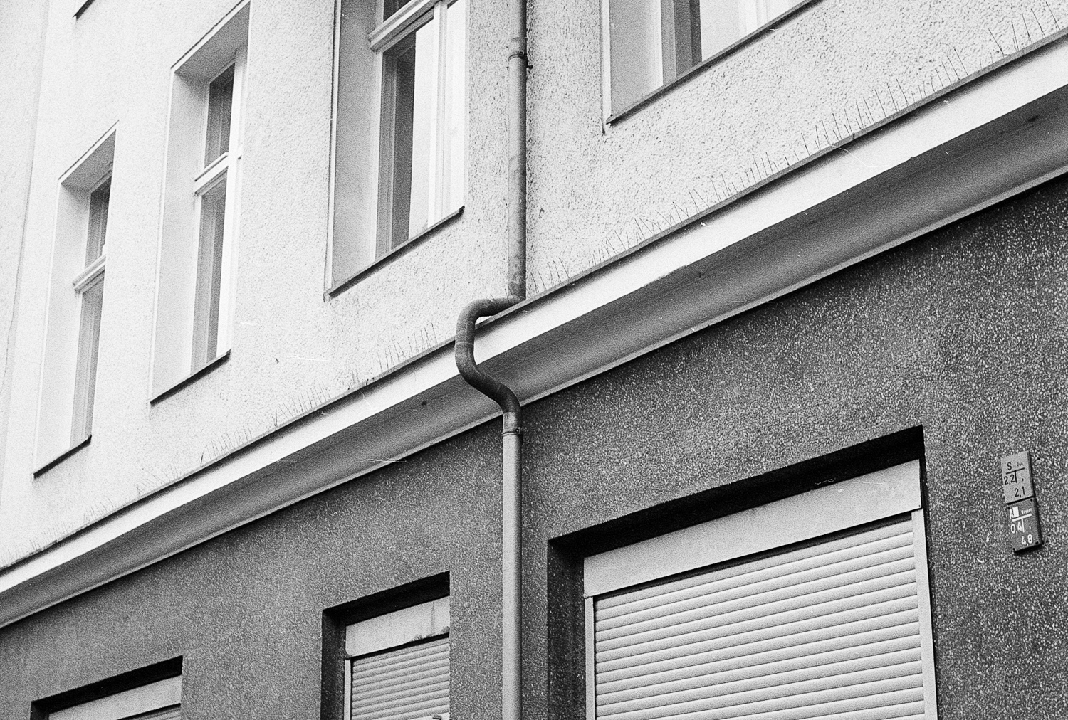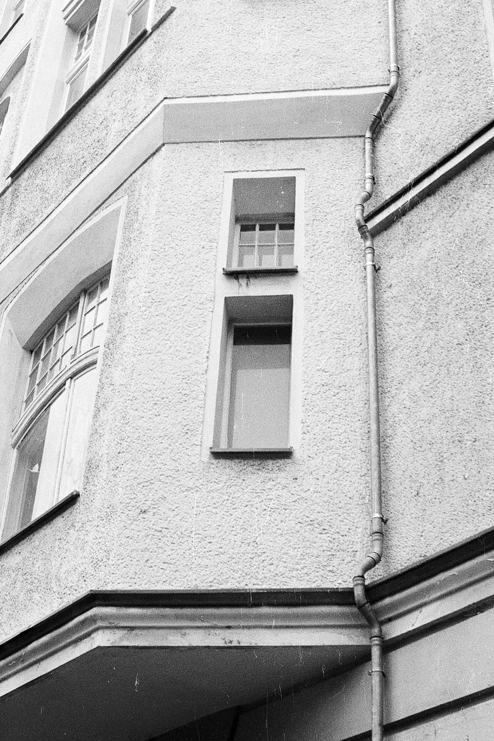 Most times you find the architectural facade elements having been prioritized over the pipe routing. Interestingly though, sometimes a previous pipe routing was carried over and integrated in the resulting facade renewal.